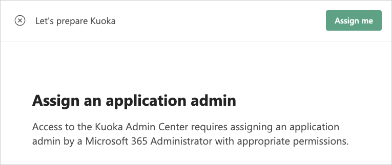 To assign your currently logged-in user as application admin, click the "Assign me" button in the top right corner. You'll be prompted to grant additional permissions to manage the app. Click "Accept" to proceed.