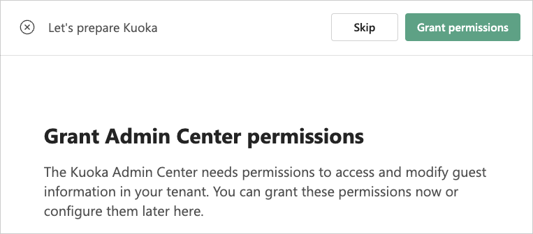 If you prefer to access the Guests admin center without granting permissions right now, you can skip this step. However, please note that without these permissions, certain features may be unavailable. You can grant the necessary permissions later in a granular manner in the Guests admin center under Settings > Permissions.