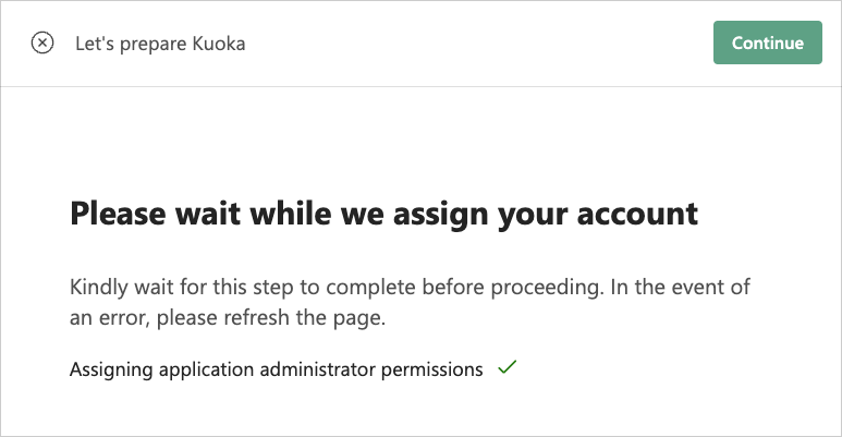 After clicking "Assign me", your account will be added as the application admin. Wait until this process is complete.