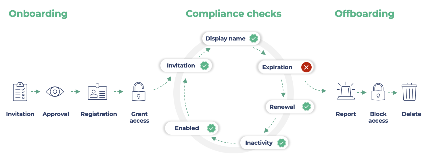 To ensure sustained cleanliness and security, administrators create individual onboarding, monitoring, and offboarding policies for guests. These policies outline the necessary steps for inviting guests, overseeing their status during collaboration, and removing guests once collaboration end. -