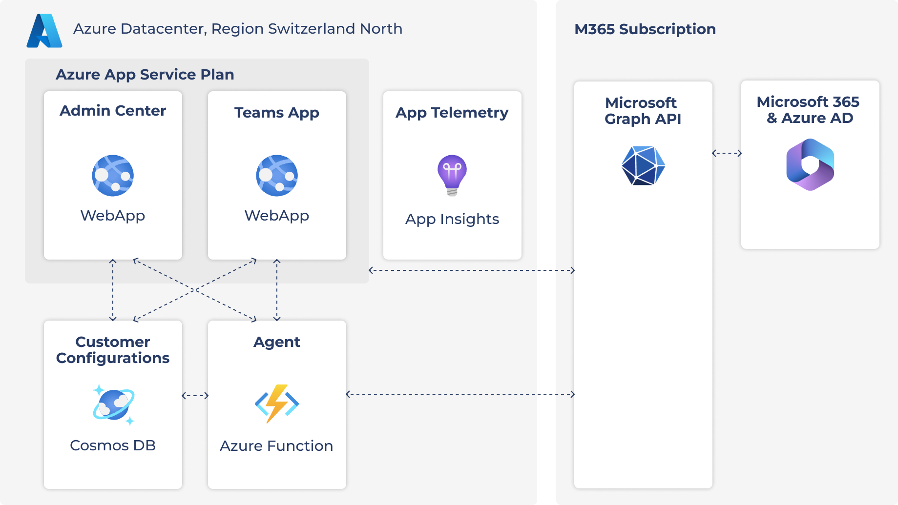 Authentication is ensured through dedicated Entra ID Application registrations in Microsoft’s Identity Platform, guaranteeing compliance with Microsoft security standards.