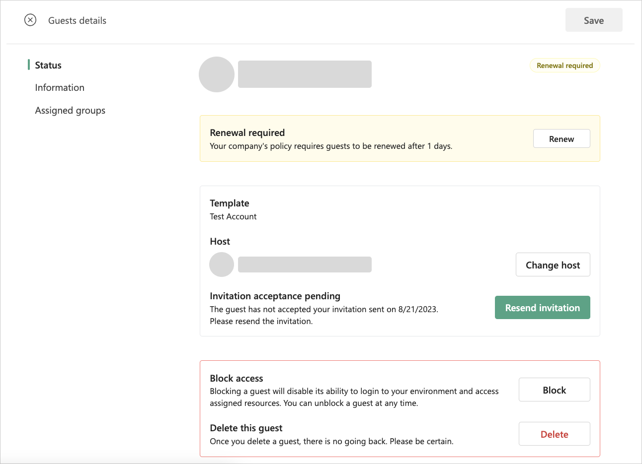 If guests have a renewal policy assigned, access must be renewed by the host after a period defined by your administrator. Simply renew this guest by clicking the renewal option or block or delete the guest if no longer needed.